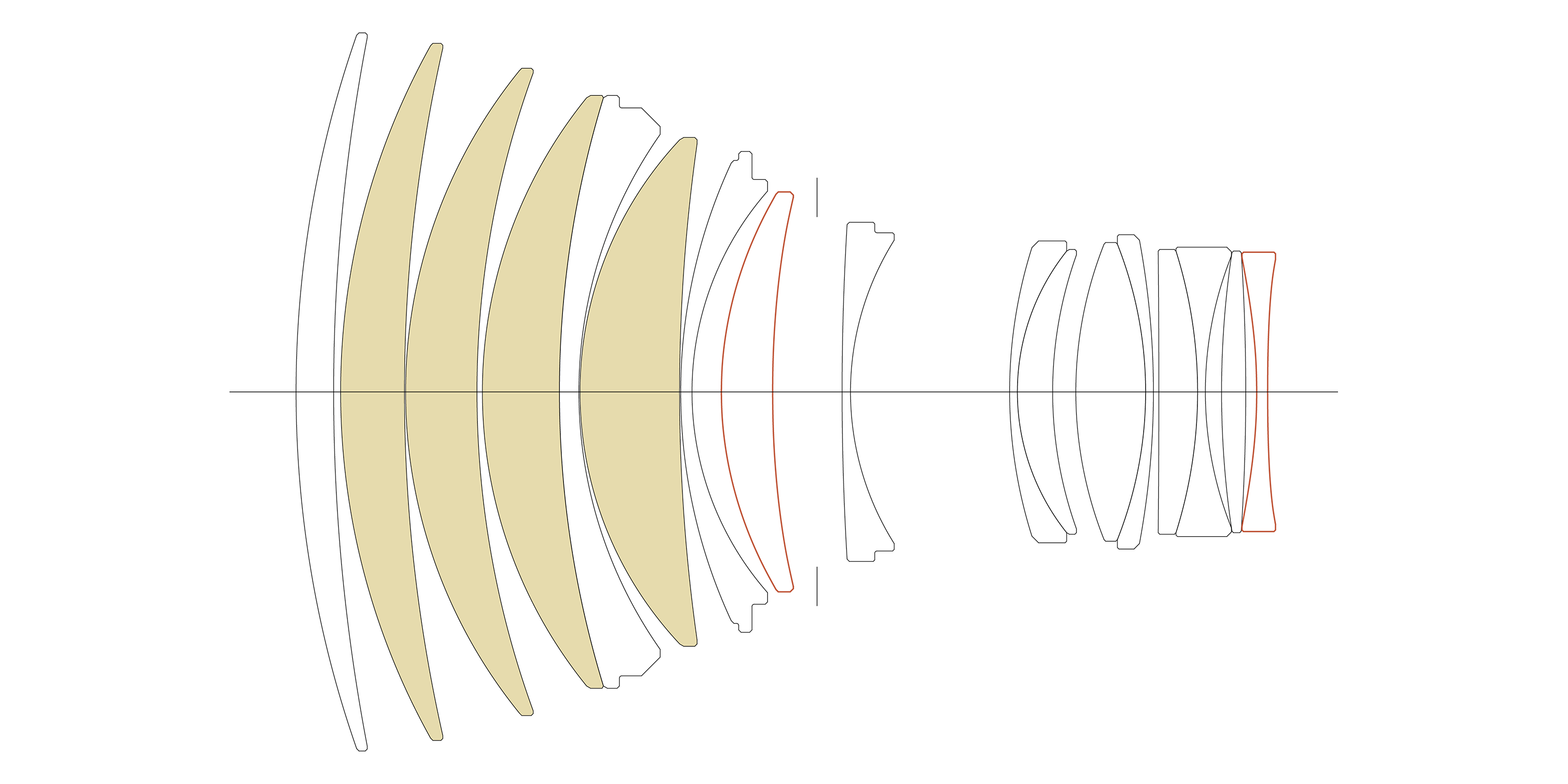 Konstrukce objektivu17 členů 13 skupin (4 FLD a 2 asférické členy)