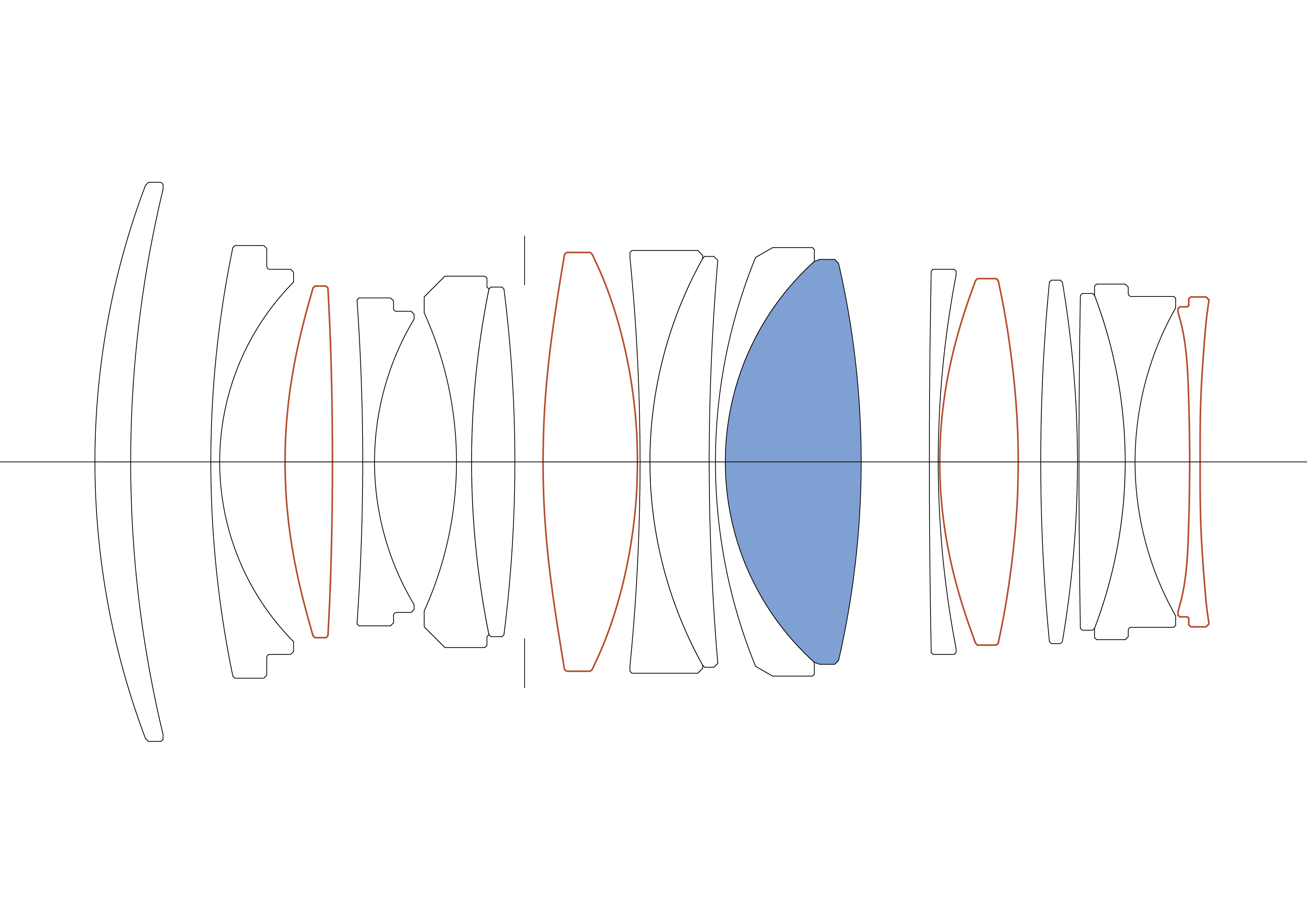 Konstrukce objektivu17 členů 13 skupin (1 SLD a 4 asférické členy)