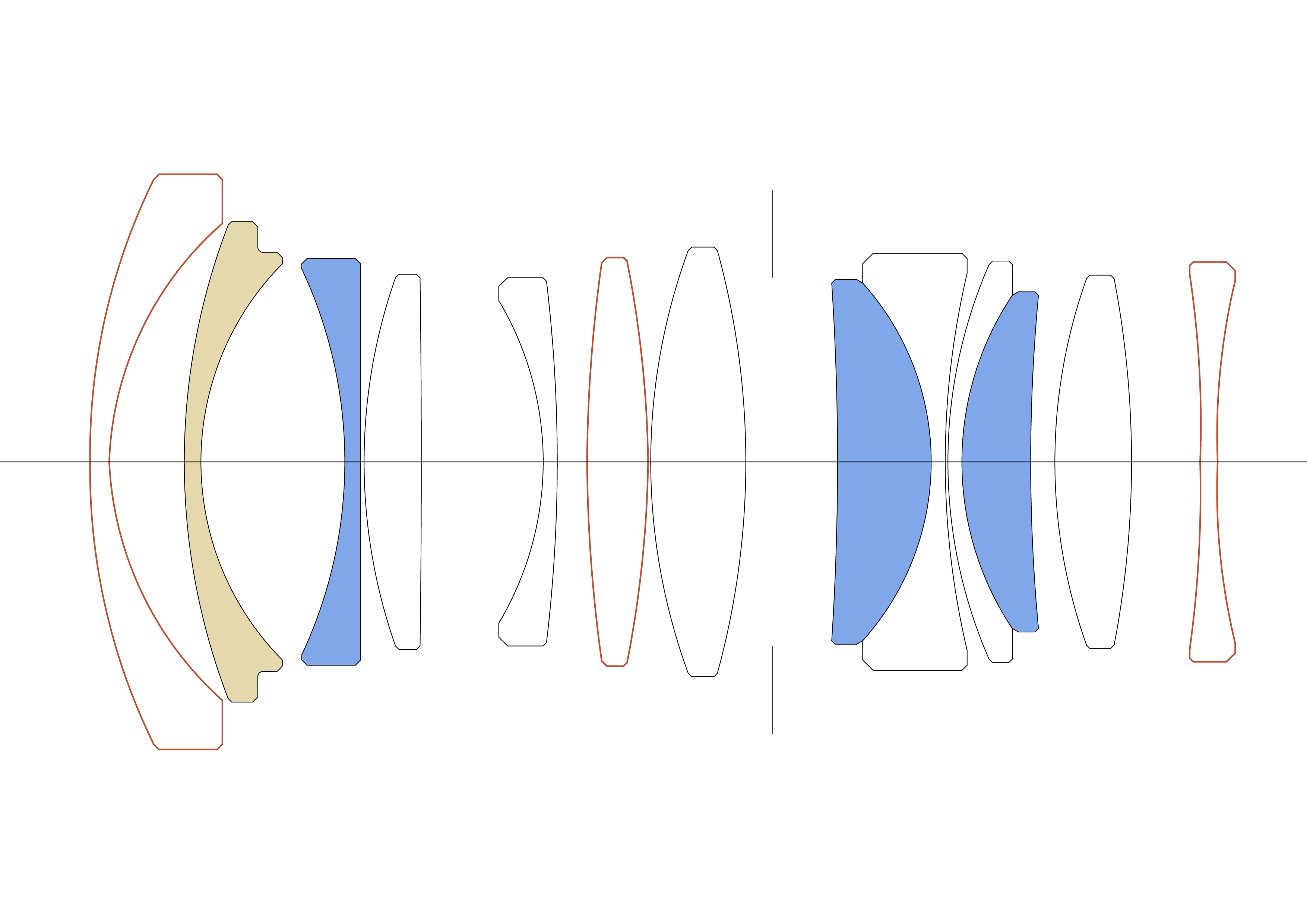 Konstrukce objektivu13 členů 11 skupin (1 FLD, 3 SLD, 3 asférické členy)