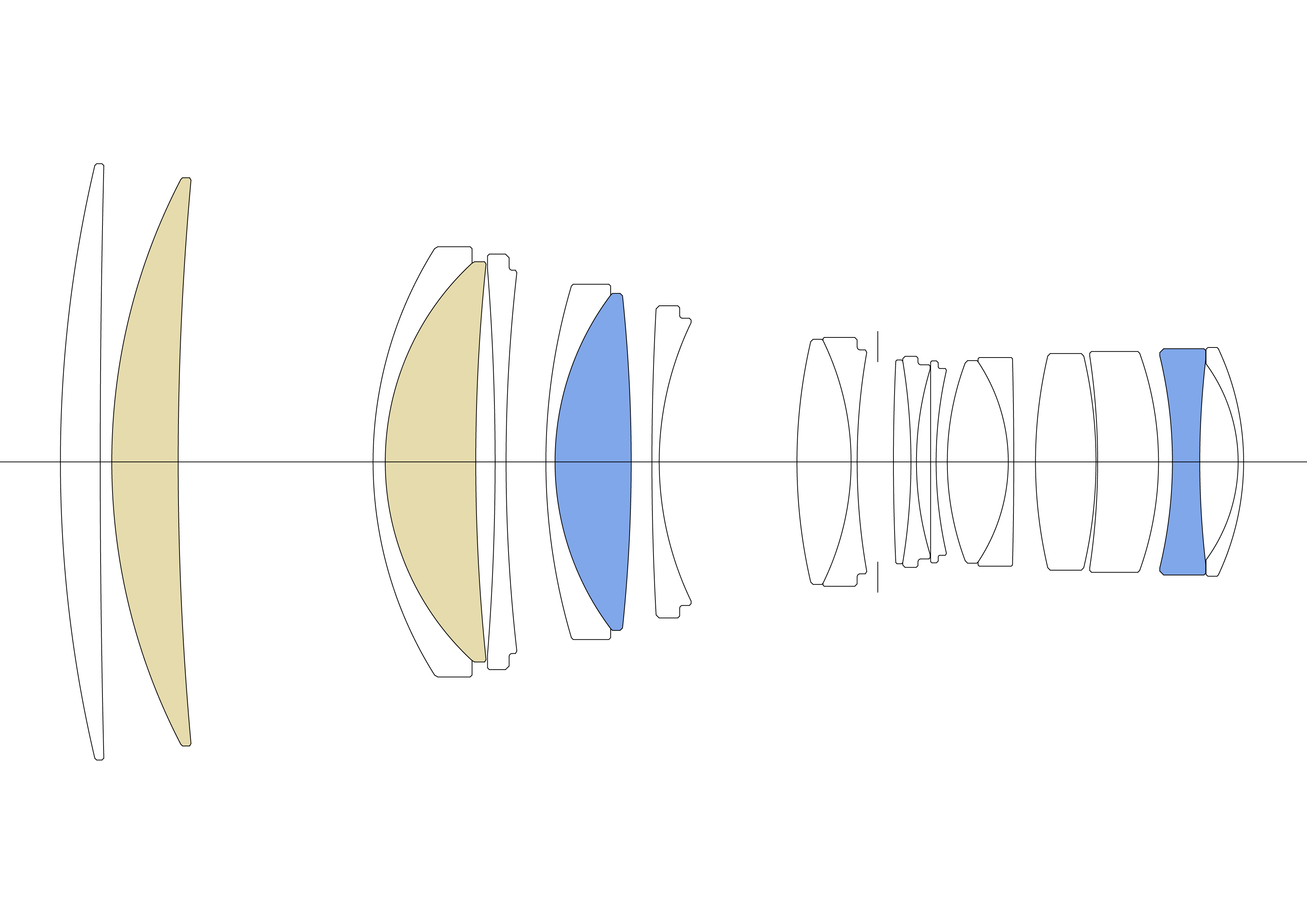 Konstrukce objektivu19 členů 14 skupin (2 FLD, 2 SLD)
