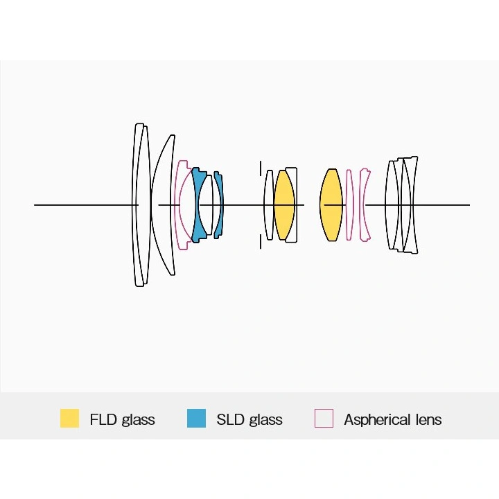 Optická skladba: 16 elementů / 12 skupin (2 FLD členy, 2 SLD členy, 3 asférické členy)