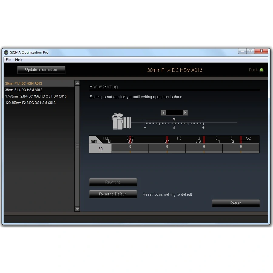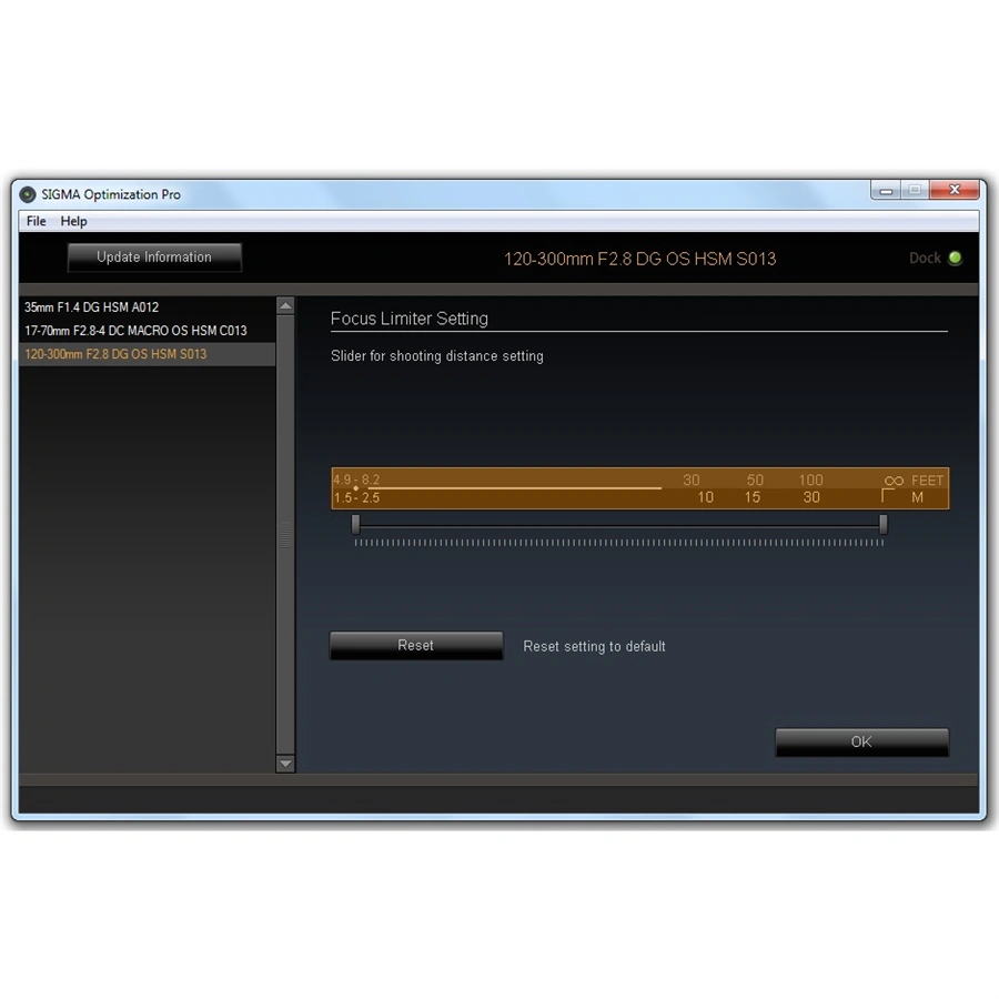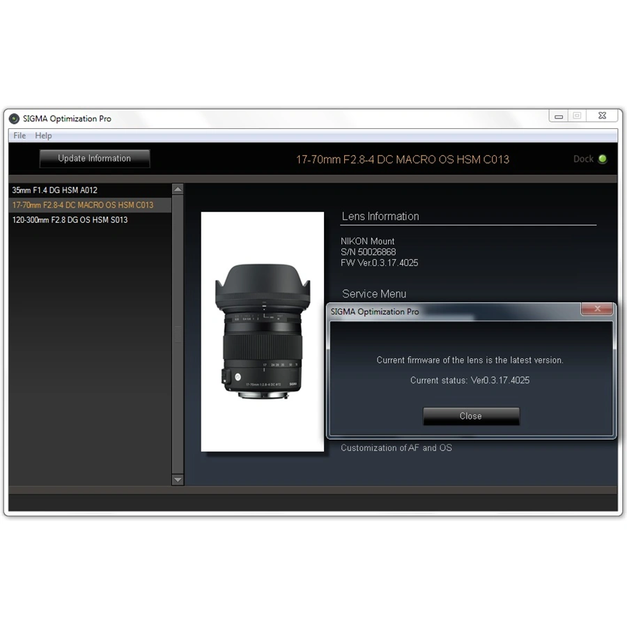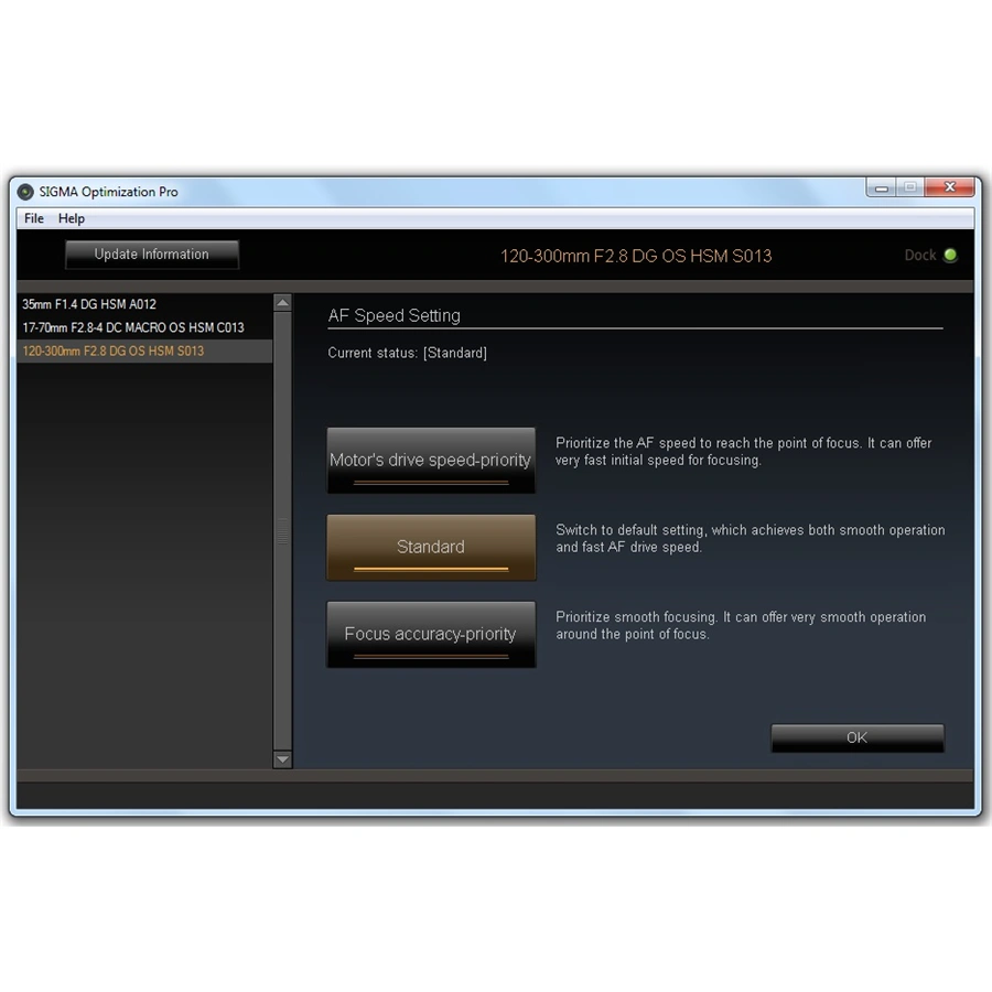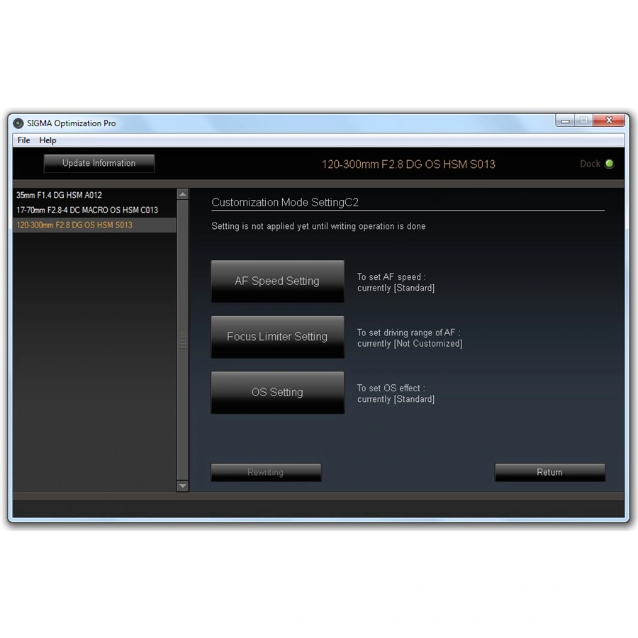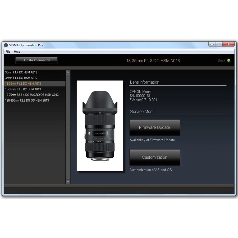 USB dock je určen pro objektivy nové SGV řady SIGMA Art, Sports, Contemporary. Vyrábí se v několika verzích, vždy s konkrétním bajonetem. Zařízení umožňuje uživatelům velmi jednoduše, a v domácích podmínkách, aktualizovat firmware objektivu, seřídit u DSLR zrcadlovek rovinu ostrosti (FF/BF), nastavit u starších objektivů mód ostření MO, nastavit u novějších modelů programovatelná tlačítka a u teleobjektivů řady Sports a Contemporary programovat uživatelké módy spolu s dalšími parametry objektivu, díky kterým si objektiv přizpůsobíte vašim specifickým potřebám.